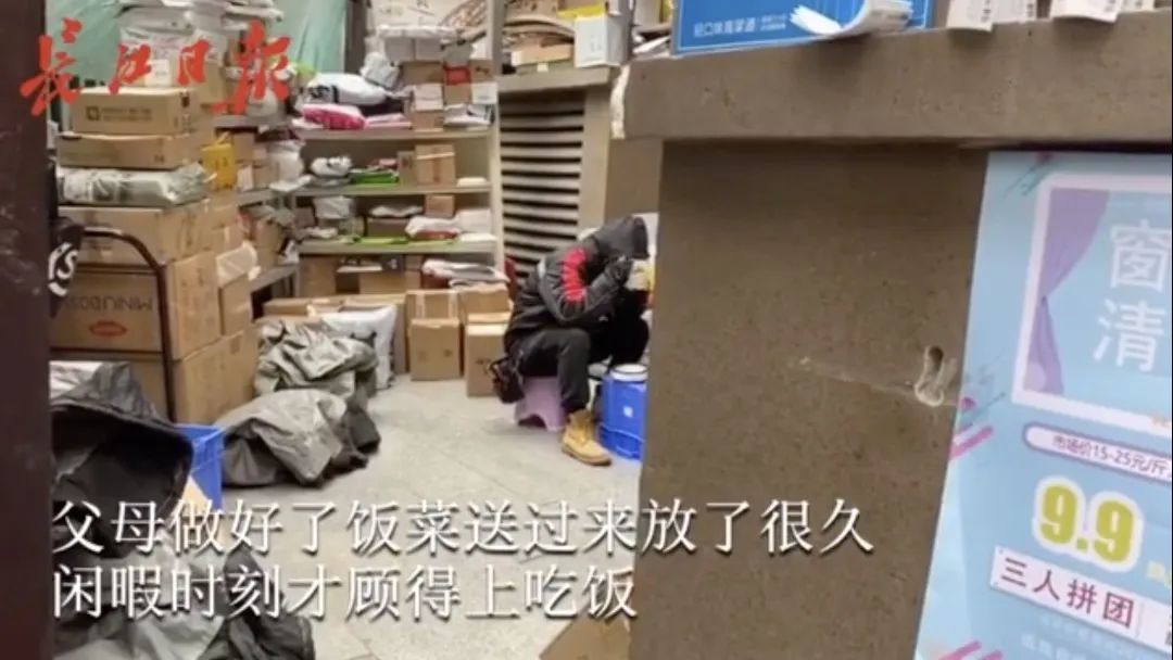 在一次媒體采訪中,一位快遞小哥始終背對(duì)鏡頭整理貨品,僅在空檔時(shí)間坐在小板凳上吃兩口父母送來的飯菜?!拔业迷趰?,不然武漢人民的口罩怎么???”