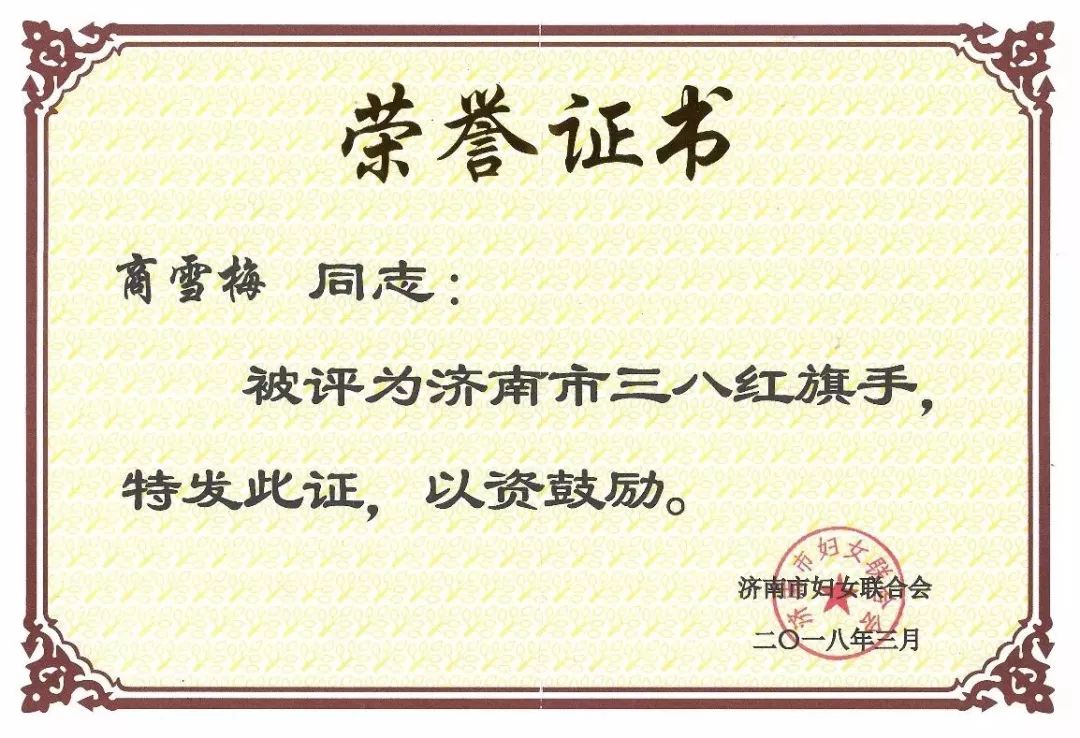2018年3月7日上午,濟南市婦聯(lián)召開了紀(jì)念“三八”國際婦女節(jié)108周年暨“爭創(chuàng)出彩人家 共建美麗鄉(xiāng)村”活動動員部署大會。濟南市委副書記蘇樹偉,濟南市委常委雷天太等領(lǐng)導(dǎo)出席了大會。會上,金諾國際拍賣有限公司、山東海量投資有限公司董事長商雪梅同志被授予“濟南市三八紅旗手”榮譽稱號。