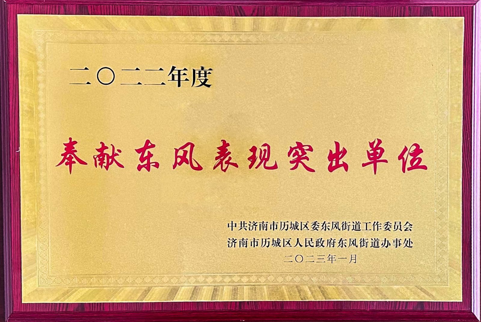 2022年度,金諾國(guó)拍集團(tuán)積極配合中共濟(jì)南市歷城區(qū)委東風(fēng)街道工作委員會(huì)和濟(jì)南市歷城區(qū)人民政府東風(fēng)街道辦事處,在工作中積極作為。此次榮譽(yù)的獲得,是對(duì)金諾國(guó)拍集團(tuán)2022年度工作的進(jìn)一步肯定。